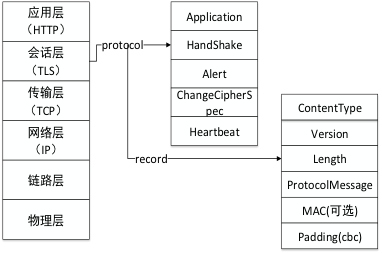 TLS 協議本身又是由 record 協議傳輸的,record 協議的格式如上圖最右所示。