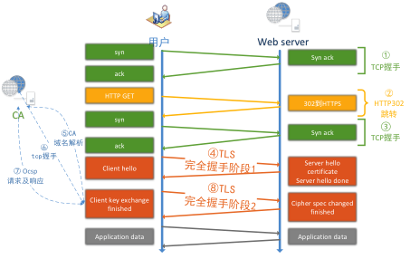接下來看 HTTPS 的訪問過程,相比 HTTP 要復雜很多,在部分場景下,使用 HTTPS 訪問有可能增加 7 個 RTT。如下圖:
