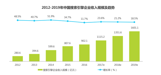 2016年的搜索引擎企業市場收入達到902.1億元同比增長11.7%,2016年為搜索引擎調整之年,預計在2019年中國搜索引擎市場規模將要達到1500億元,艾瑞網分析認為2016年搜索引擎市場的增長放緩主要是和政策的調整有很大關系,沖擊了整體市場