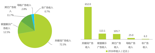 2016年中國搜索引擎廣告中,關鍵詞廣告收入652.0億元,占比72.3%聯盟展示廣告收入113.1億元,占比12.5%,其他收入105,7,占比11.7%。導航廣告收入25億元占比2.8%非廣告收入6.3億元都切0.7%,
