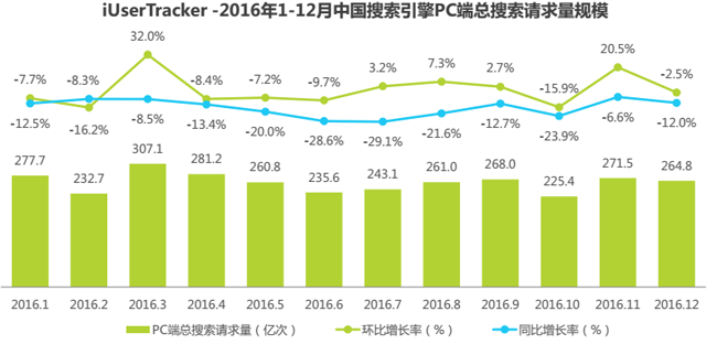 根據艾瑞網民行為監測工具監測數據,16年中國搜索引擎PC總搜索請事量(包括網頁搜索、圖片搜索、視頻搜索、問答搜索、新聞搜索、音樂搜索、地圖搜索)整體規模出現明顯下滑,216年12月PC端總搜索請求量規模為264.8億次.同比下滑了12.0%,