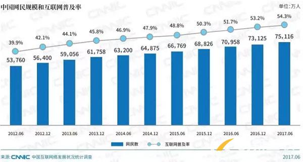 1、根據《2017中國互聯網絡發展狀況統計報告》,截至 2017 年 6 月,我國網民規模達到 7.51 億,互聯網普及率為 54.3%(如下圖所示),網民使用手機上網的比例 96.3%,手機網民規模達7.24 億。面對這么龐大的網名數,還擔心互聯網沒有企業潛在客戶嗎?