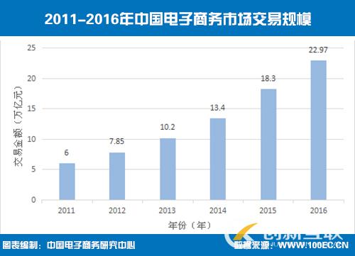 2、據中國電子商務研究中心監測數據顯示,2016年中國電子商務交易額22.97萬億元(如下圖所示),同比增長25.5%。其中,B2B市場交易規模16.7萬億元,網絡零售市場交易規模5.3萬億元,生活服務O2O交易規模9700億元。面對如此高的網絡交易金額,您還有什么理由不去做企業網站嗎?