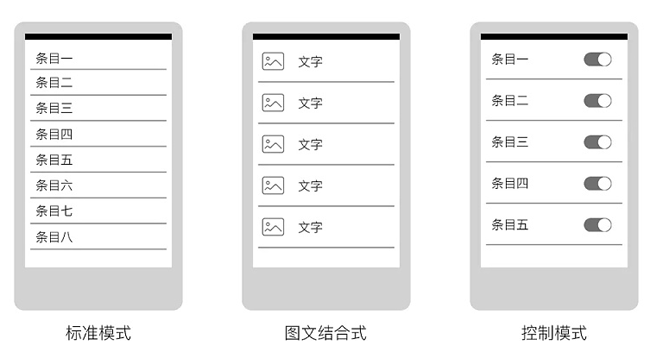 垂直式列表一般有三種展示模式,有標準模式,圖文模式以及控制模式。