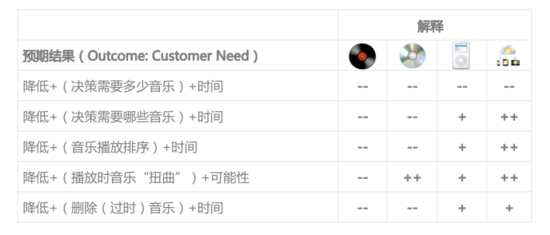 這個例子中,評分級別較少:最差為–,最好為++;競品分類是依據歷史時間軸進行的滿足聽歌需要的產品大類排序。