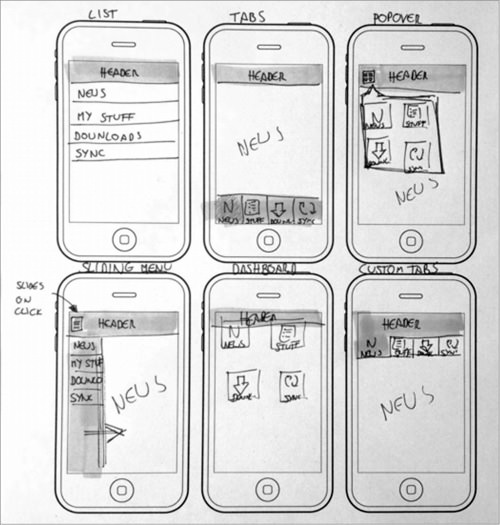 上面的截圖顯示了6個不同的想法為一個應用程序的主菜單(,加上生動地證明了我的草圖不漂亮)。我不經常拿出六個版本(我想告訴自己,我是一個結構的第一人),但我會盡量去創造一個鍵屏幕至少有三個變種。因為這是頭腦風暴,你會想了很多的選擇在后面討論,數量是你的朋友在這里。