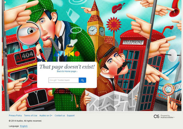 Audiko的404插圖涵蓋了整個頁面,其中包含一些鏈接和一個搜索欄。Audiko的主要重點是創建包含動畫人物和其他符號的插圖。為了方便觀看者,使用搜索欄非常適合返回正確的頁面。