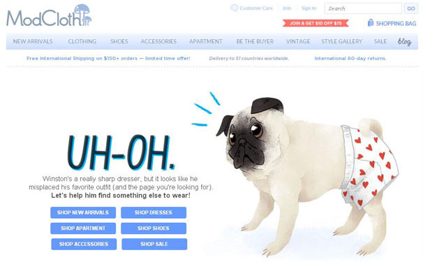 “Mod Cloth”是一個銷售面料的網頁,在404頁面上使用可愛的狗狗圖像,使這個頁面具有高品質。鏈接和菜單欄的對齊非常出色,巧妙地與插圖一起使用。所有相關信息都可以在這個錯誤頁面找到,沒有麻煩。除了圖像,該部分的其余部分與主頁相同,即菜單和頁腳。當然,這是一個吸引訪客和參與的有吸引力的頁面。我喜歡如何顯示Mod Cloth 404頁面。