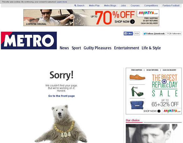 Metro 404頁面真的很棒,因為可愛的熊圖像,人們都在愚弄。此圖像僅具有“魔獸世界”的效果,并且在此站點的主頁上拼命地點擊并重定向訪問者。此站點提供了相應的鏈接,但根據頁面,空間非常小。此頁面的大空間是空的,使其設計不佳。