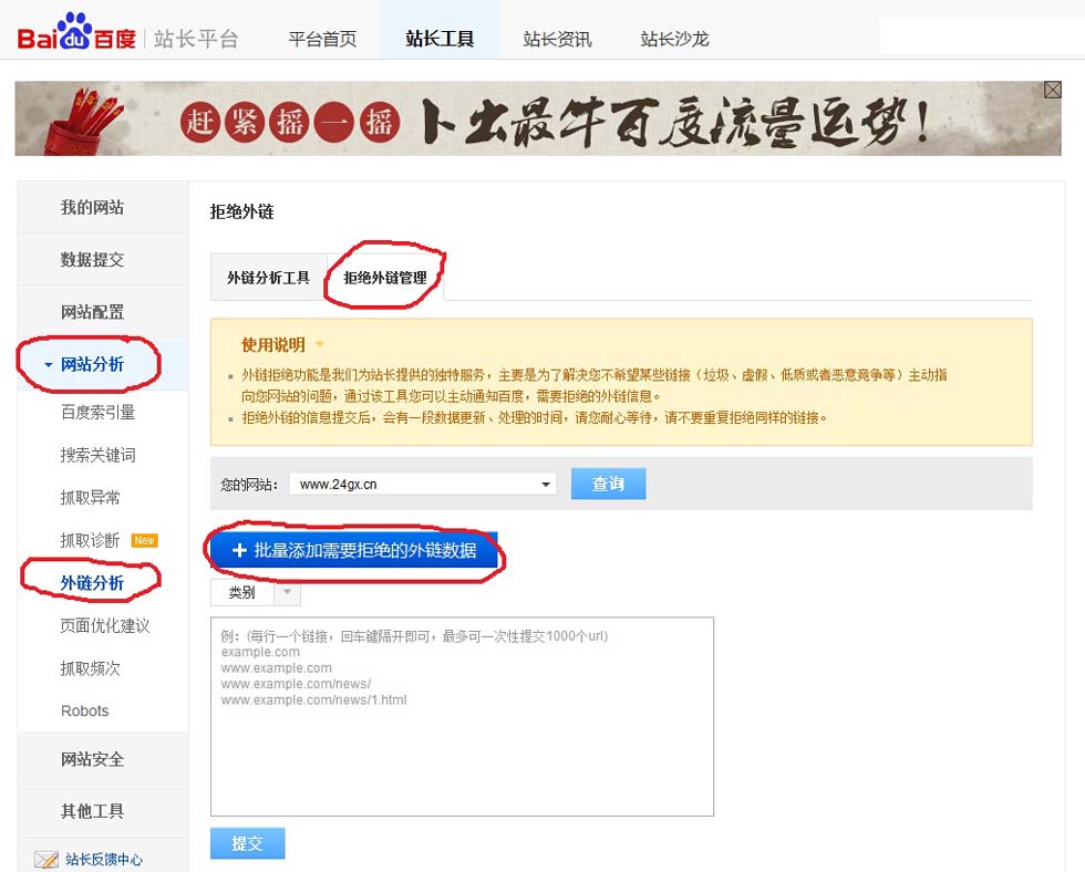 如果出現(xiàn)了這樣的現(xiàn)象,你也不要太緊張,因?yàn)榘俣纫蚕氲搅?,你可以通過遞交拒絕外鏈的數(shù)據(jù)來維護(hù)你的網(wǎng)站。具體辦法是打開百度站長(zhǎng)工具,注冊(cè)登陸之后添加你的網(wǎng)站,然后點(diǎn)擊網(wǎng)站分析――外鏈分析――拒絕外鏈管理――批量添加需要拒絕的外鏈數(shù)據(jù),如圖所示:
