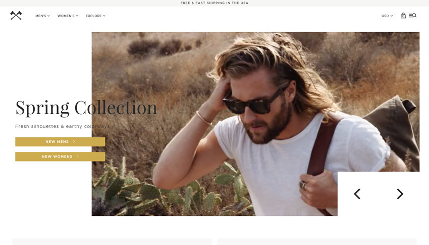 正如您在此示例中所看到的,Shwood使用“New”而不是“Shop”來將訪問者引導至產(chǎn)品頁面。這個CTA比“Shop Men”的行動更少,但它確實有助于告訴訪客他們正在為您的商店購買新來的人。