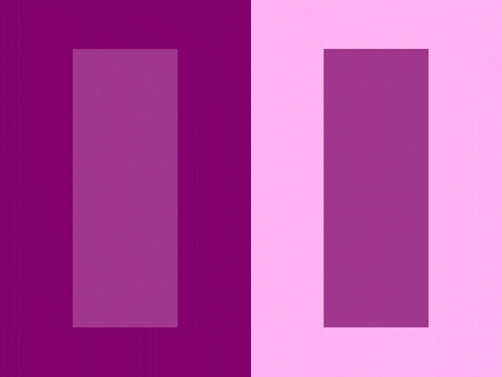 兩個紫色的顏色相同么? 這種錯覺很微妙,但是非常有吸引力,看看上面的動畫,你會發現左邊的紫色塊比右邊的紫色塊更亮,但實際上兩者都是一樣的。