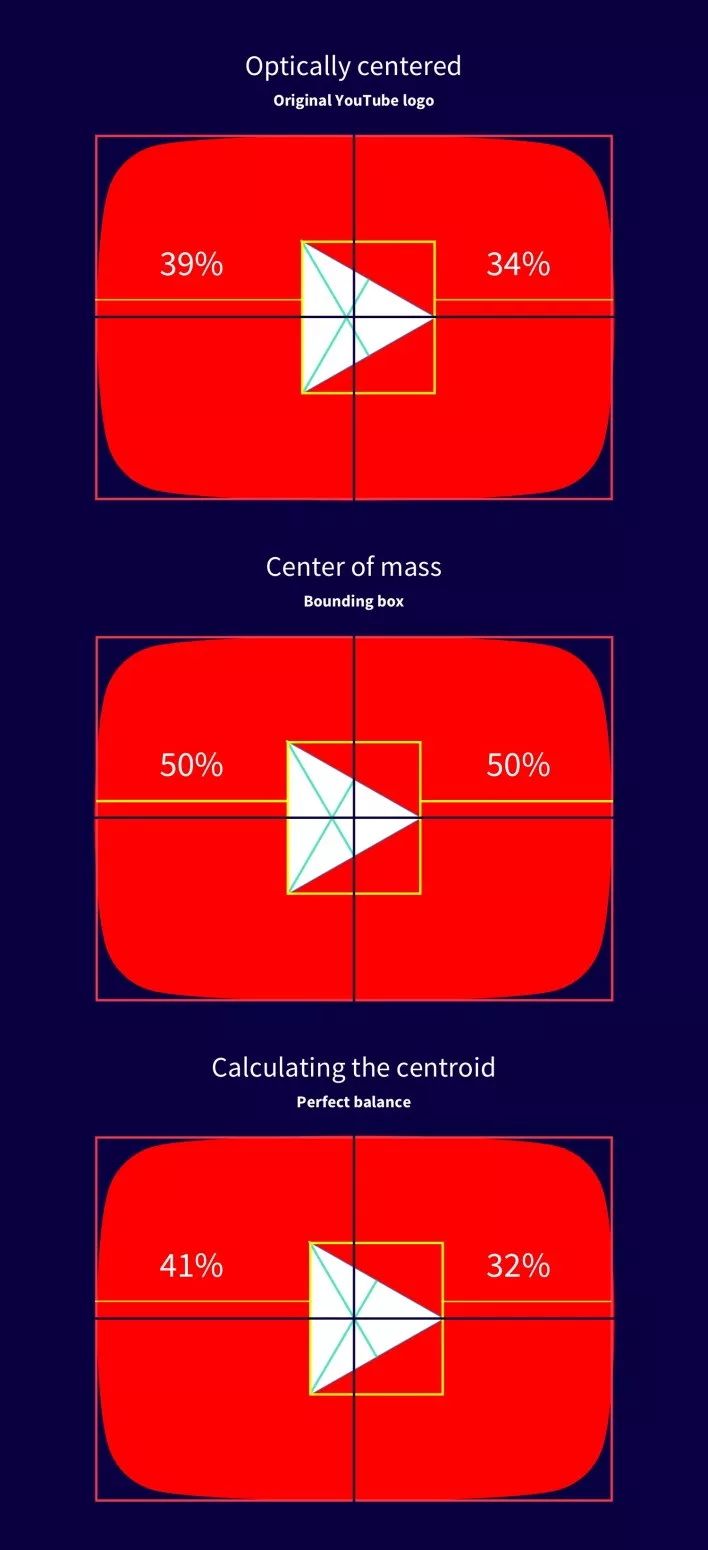 你能找到三角形的中心么? 并非所有的圖標都是對稱的,對于我們常見的播放按鈕圖標,找到視覺的中心實際上很困難。造成這種情況的原因是由于三角形分裂錯覺的效應,中心位于三條中線(頂點和對邊的中點的連線)交點,此點即為重心。