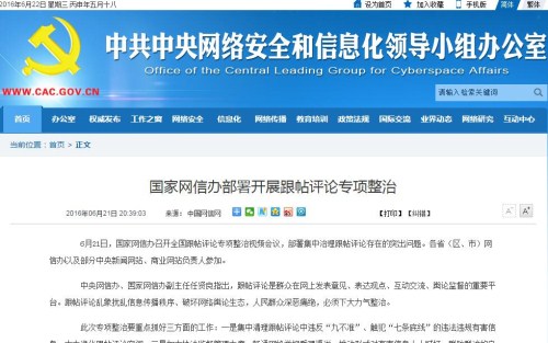 網信辦部署開展跟帖評論專項整治,并于21日召開全國跟帖評論專項整治視頻會議,部署集中治理跟帖評論存在的突出問題,各?。▍^、市)網信辦以及部分中央新聞網站、商業網站負責人參加。