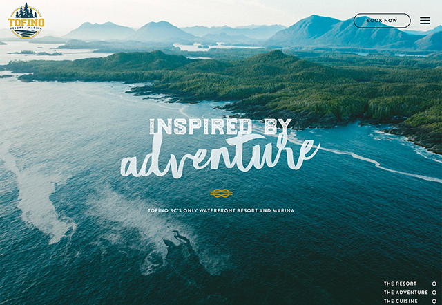 Tofino度假村吸引用戶使用的是一個偉大的形象和有趣的字體。“現在的書”呼吁行動是在頂部的角落,用戶通常會尋找導航,但菜單塞在一個漢堡包圖標中,CTA是焦點。