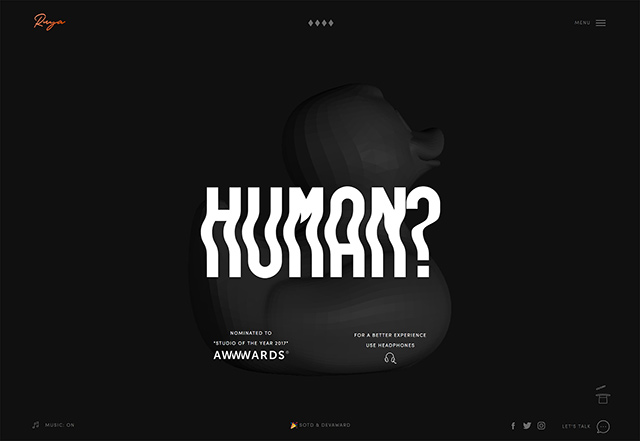 Ruya Digital選擇了一種更簡約的風格,有深色的背景,但簡單的中間屏幕動畫和不同尋常的文字處理創造了一個視覺興趣點。伴隨元素和文本是小的,并隱藏在屏幕的邊緣,以確保用戶關注主消息。再一次,沒有主要的導航存在;它需要點擊才能訪問它。