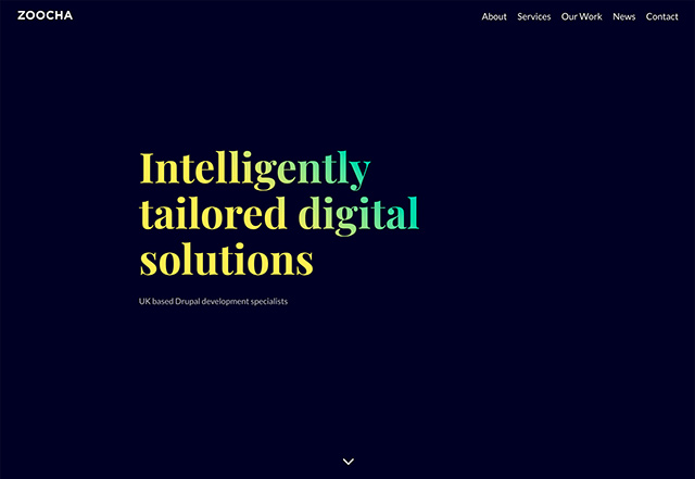 漸變不只是背景和照片疊加。一個堅實的梯度也可以增加對文本元素的強調,當使用的目的。印刷術的發展趨勢是向更簡單的字體傾斜,并帶有一點“額外的東西”。這些額外的東西可以是任何東西,從照片填充到流行色到文本處理,例如大小寫或動畫。現在…梯度。誠然,如果你不喜歡漸變,這可能是一個很難遵循的趨勢。(你的平面設計純粹主義者知道你是誰。)但它們絕對是驚人的。Zoocha使用了一個巨大的淡黃色和藍色的漸變在一個現代的襯線,在一個主要是普通的屏幕。這個設計的訣竅是漸變。其他設計的簡單性讓它脫穎而出。