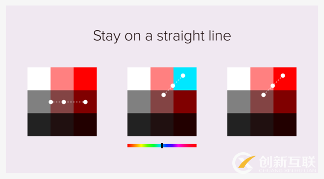 當我在調色板上選擇色彩的時候,我會傾向于沿著直線路徑來挑選色彩,從左到右,從上到下,或者沿著對角線來選取色彩。這樣所獲得的一套配色可以兼顧到不同的按鈕狀態(可用/不可用,活動/非活動),兼顧到視覺主體和邊框,背景等。我們也可以在取色器的同一個位置取色,調整色調,獲得的一組色度接近色調不同但是高度協調的色彩組合。上圖中,中間那個就是。