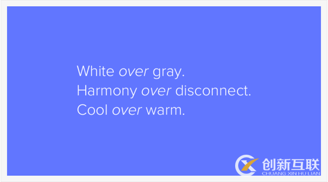 在開始著手挑選配色之前,我常常會翻看Dustin Senos關于設計原則的短文。他在文章中,闡述設計原則的方式非常有意思,干練而有趣,“方向優于選擇”,“合適優于一致”,“發展性優于總結”。其實如果借用這種句式來總結配色也不錯:“白色優于灰色”,“和諧優于錯位”,“沉靜優于熱烈”。當我在工作的時候,我會時刻謹記這些配色策略,它們更像是一種感覺上的規范,就像用戶角色引導UX設計師來設計體驗一樣。