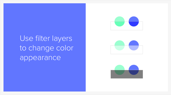 想象有一張半透明的紙,當我們將它置于色彩上方的時候,它能夠從視覺上“消減”色度。我們可以在PS和Sketch中來模擬這樣的“紙”,新建形狀,通過調整透明度和混合模式,或者搭配使用來實現不同的效果,我們還可以調整紙張本身為白色或者黑色,在疊加混合模式下,能對色彩的飽和度產生不同的影響。在有的UI設計項目當中,會借助這樣的技術來暫時調整整個區域的敏感色度,這比改色更加輕松,還保持了色彩之間的協調度。