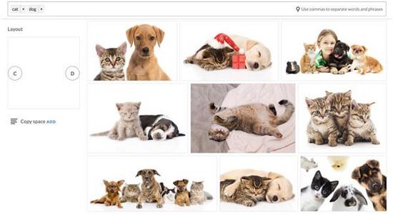舉個例子,輸入關鍵詞「cat」,移動到左邊,再添加關鍵詞「dog」,放到右邊,就可以找到左邊是貓,右邊是狗的圖片。隨意移動關鍵詞的位置,可以在搜索結果中實時看到更改。