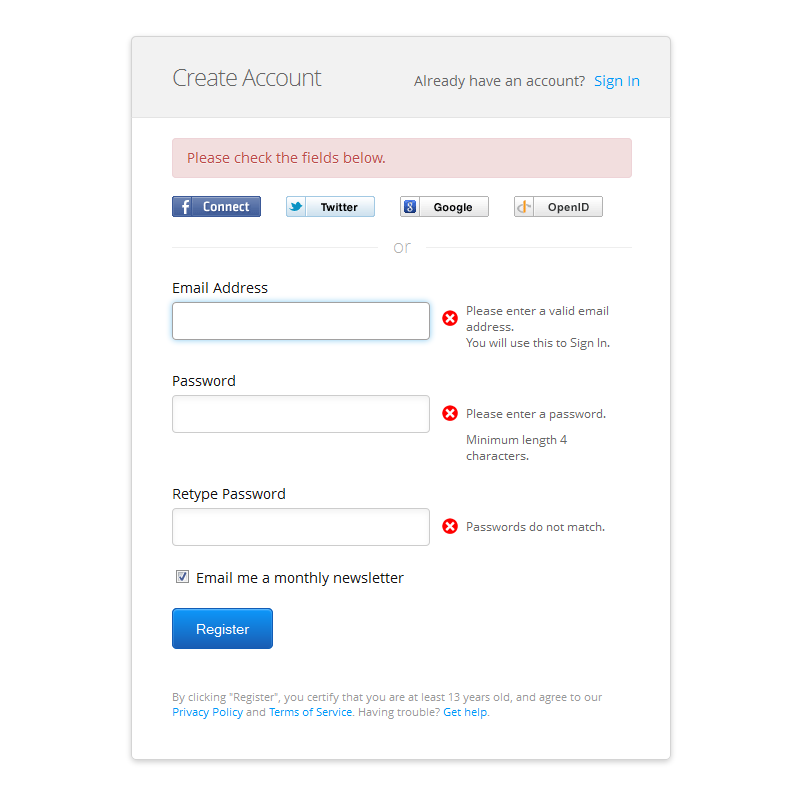 現(xiàn)在還有很多設(shè)計師開始將錯誤提示做成文字標簽形式,將其和控件放在一起。這樣子用戶就可以很容易的讀取錯誤信息,一眼就能看出來哪里出錯了,不用根據(jù)提示的控件名稱去尋找出錯的位置,因為錯誤提示就在發(fā)生錯誤控件的旁邊。此外還很容易改正,因為用戶不用再跳轉(zhuǎn)頁面或去記那些冗長的錯誤信息。