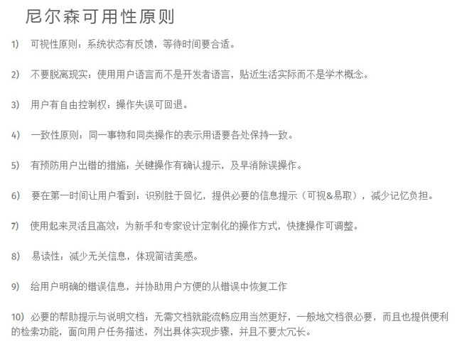 當設計完成后最好對自己的方案進行排查,很多時候容易當局者迷“忽視”了很多問題。這里可以積極請教同事尋找問題,或者使用尼爾森的可用性原則進行排查。