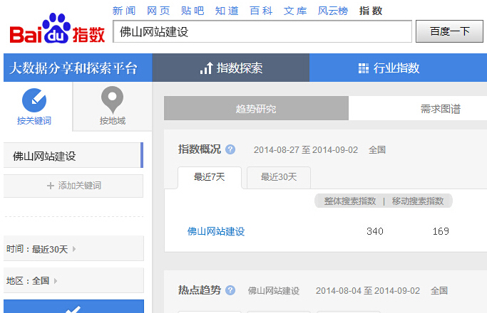 三、通過百度指數來了解相關關鍵詞的搜索量,通過這個可以很直接的知道您所需要確定的關鍵詞是否熱門,是否有一定的搜索量,咱們還是以“手機網站建設,佛山