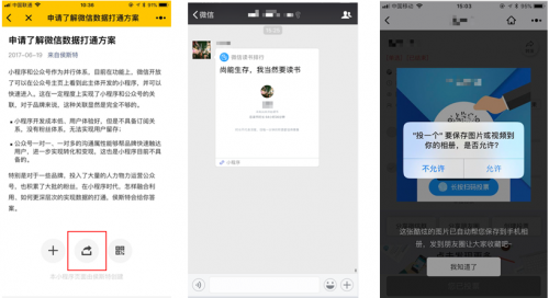 小程序是社群傳播的良好載體。張小龍說:“小程序可以分享到聊天里面,可以分享到群里面“。分享到群里面是非常大的一個想象空間。在分享體驗上,小程序也有著獨特的優勢:可以一鍵彈出選擇框,比HTML5的分享更便捷,小程序內嵌直接分享功能,分享后顯示更為醒目,生成朋友圈分享圖并自動保存。