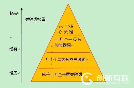 次一級關鍵詞相當于塔身部分,可能有十幾個,放在一級分類首頁。意義最相關的兩三個關鍵詞放在一起,成為一個一級分類的目標關鍵詞。