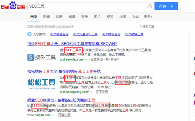 另外從圖上我們也可以看到分詞組合后得到三個價值詞SEO、SEO工具、工具,這些詞都是會被百度建立索引參與排名的重要因素,下圖是我從百度搜索結果截圖的。
