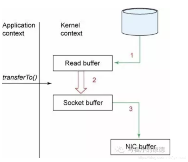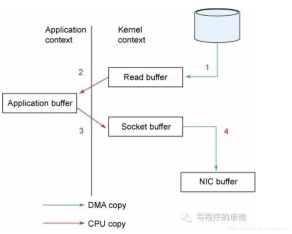 Zero Copy中直接從內核空間(DMA的)到內核空間(Socket的),然后發送網卡。