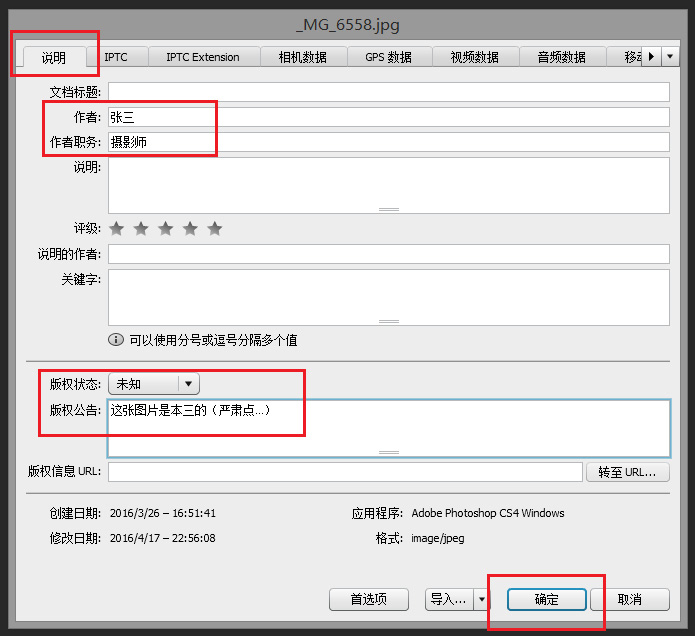為了避免被盜圖,現在很多攝影師在發布作品前都會打上自己的水印。然而,水印不但會影響照片的美觀,甚至還可以被盜圖者輕易抹掉,所以水印這個東西看似可以起到保護版權的作用,但實則并沒有什么卵用。而保護版權的最好做法,是將版權信息嵌入到圖片本身的元數據里。在Photshop里如何將版權信息嵌入圖片里呢?步驟如下:按住Ctrl+Alt+Shift+I,或者點擊文件>文件簡介,就會彈出以下的元數據窗口。然后根據提示輸入你的信息,再點擊確定保存就可以了。