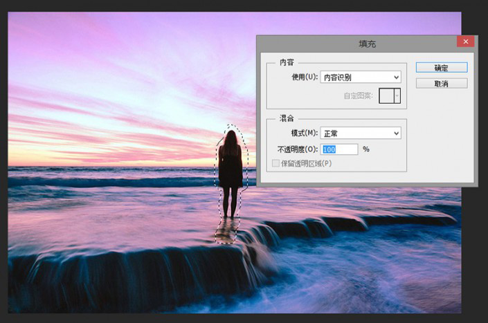 我們所知道的修補圖像方法有很多,如“仿制圖章”工具、“修補畫筆”工具等。但這一次我要給大家安利一個最簡單粗暴的工具,“內容識別”工具。你只要在一張圖片上,圈選出你要修改的區域,然后點擊“內容識別”,系統就會根據相關的像素來修復選中的區域。比如說我要把下圖中的女孩紙從畫面中除去,選中“套索”工具,對其做出一個選區。然后點擊編輯>填充>選中內容識別>確定。