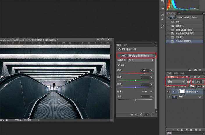 用“通道混合器”來增加圖片的明暗對比,是一種非常簡單的方法,但效果不錯。首先,創建一個“通道混合器”調整圖層,將它的預設改為“使用紅色濾鏡的黑白”,然后把圖層混合模式設為“柔光”,最后,通過調整圖層的不透明度來達到你想要得對比效果。
