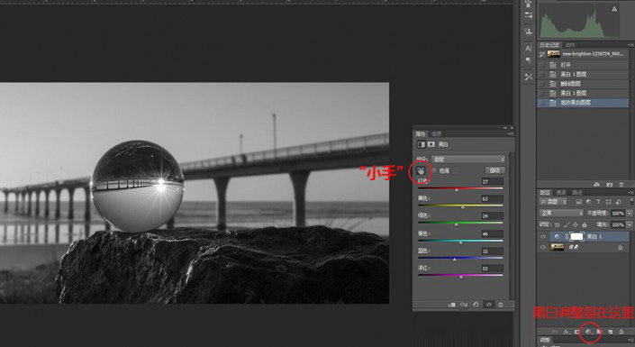 在Photshop里將一張彩色照片轉黑白可以是非常簡單(且無聊)的,你只要點擊圖像>調整>去色,就可以完成。但如果你想讓這張黑白片更上一個層次的話,不妨用一個“黑白調整層”去調,你可以用6個顏色的滑塊去控制圖像的主要顏色,還可以用那個“小手”工具單擊圖片任何的區域,進行區域性的調整。