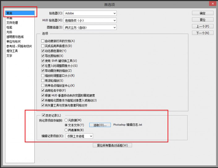 俗話說,好記憶不如爛筆頭。當你在修一組人像圖的時候,為了圖像的統一性,往往修每一張圖的步驟大致要做到一樣。當突然忘了步驟怎么辦?這時Photshop的“歷史文本”功能就派上用場了。它與“動作”功能不同,它的作用相當于幫你做筆記,助你回憶起修圖的一些步驟和細節。點擊編輯>選項>常規,就可以打開這個功能。