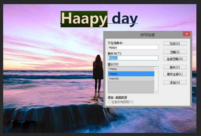 當你用Photshop做一些文字排版時,“拼寫檢查”可以幫你快速地找到不正確的詞組并提供正確參考,不過此功能目前只能識別英文。點擊編輯>拼寫檢查就能找到它。做英文排版的同學還是可以使用的哦。
