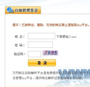 1,打開萬網域名管理平臺http://diy.hichina.com/,輸入域名和密碼及驗證碼,域名不要帶www