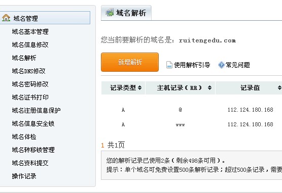 2,點左邊域名解析鏈接,然后在右邊點域名解析按鈕,如果已經有了解析過的點新增解析按鈕。