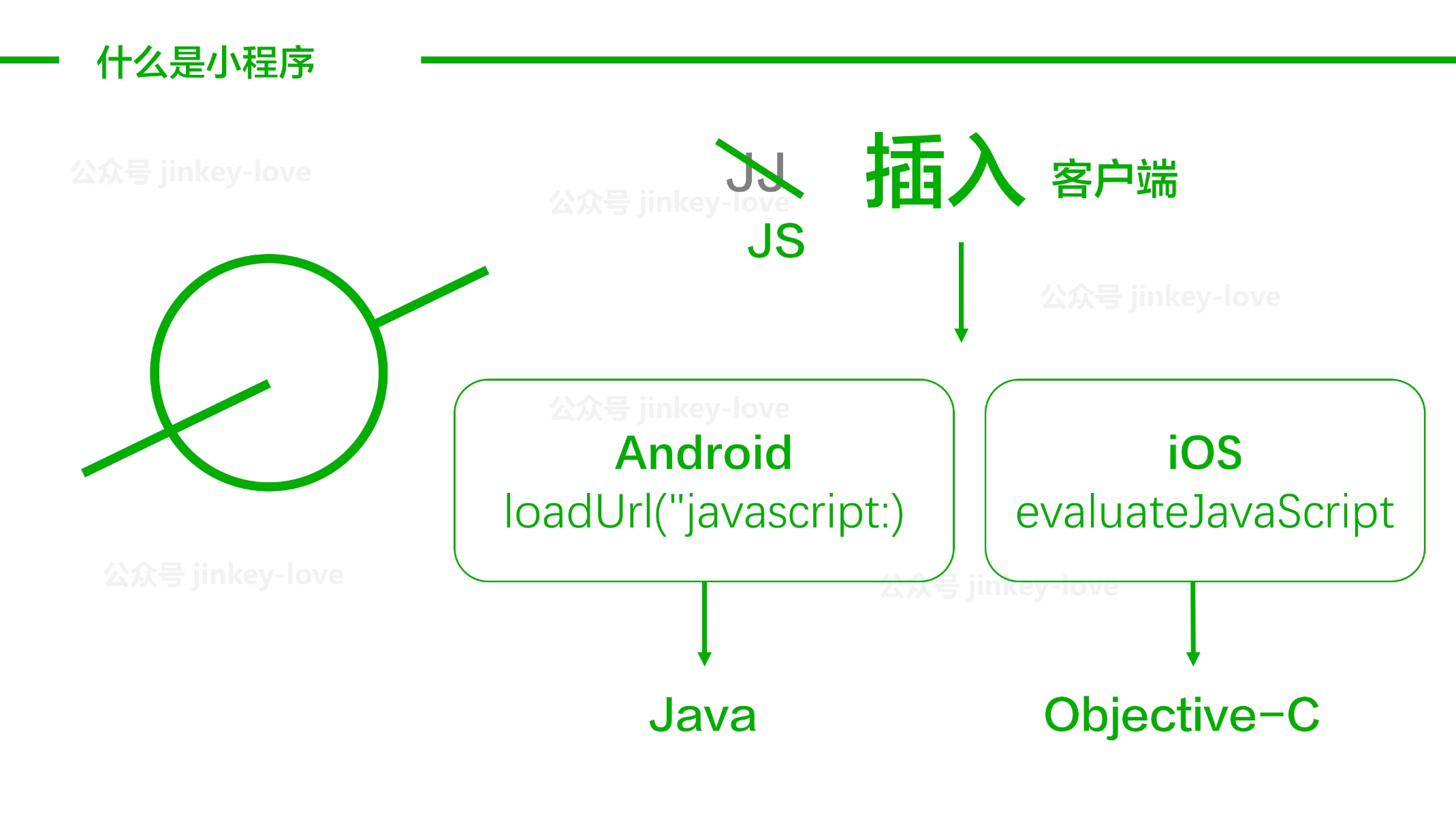 小程序寫的時候用的是 javascript 這種網頁開發語言,首次運行會把這個“網頁”緩存到本地,所以不是不用下載,而是下載的包比較小而已。然后通過 Android 或 iOS 各自的 JSBridge 方法轉換成對應的 Java 或 Objective-C 方法運行。