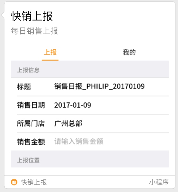上圖左邊是大家在微信公開課 Pro 會場上看到的企微云平臺的快銷上報小程序,看上去真的很像一個獨立 App,雖然我看不到他的源代碼,但是我試著還原其中一個頁面來舉例子。