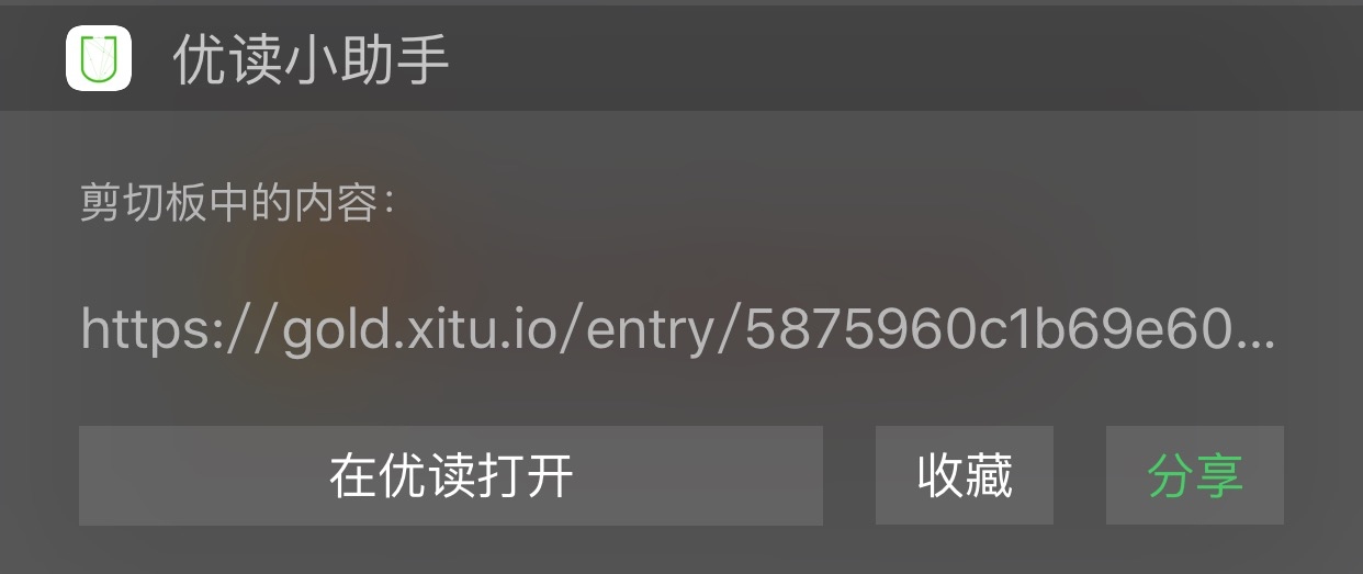 還有一個例子,一款閱讀app,叫作優讀。這款產品想要解決的問題是如何從大量信息中篩選出有價值的內容,他們的思路是利用“牛人”推薦和機器算法來完成。他們為了方便用戶去分享內容到優讀上去,做了很多便捷操作,比如你在任意一個app內閱讀內容,當你想要將這篇文章分享到優讀時,只需要復制鏈接,然后下拉通知中心,就可以選擇 收藏或分享文章了。這很便捷。但是完全不適合做小程序。