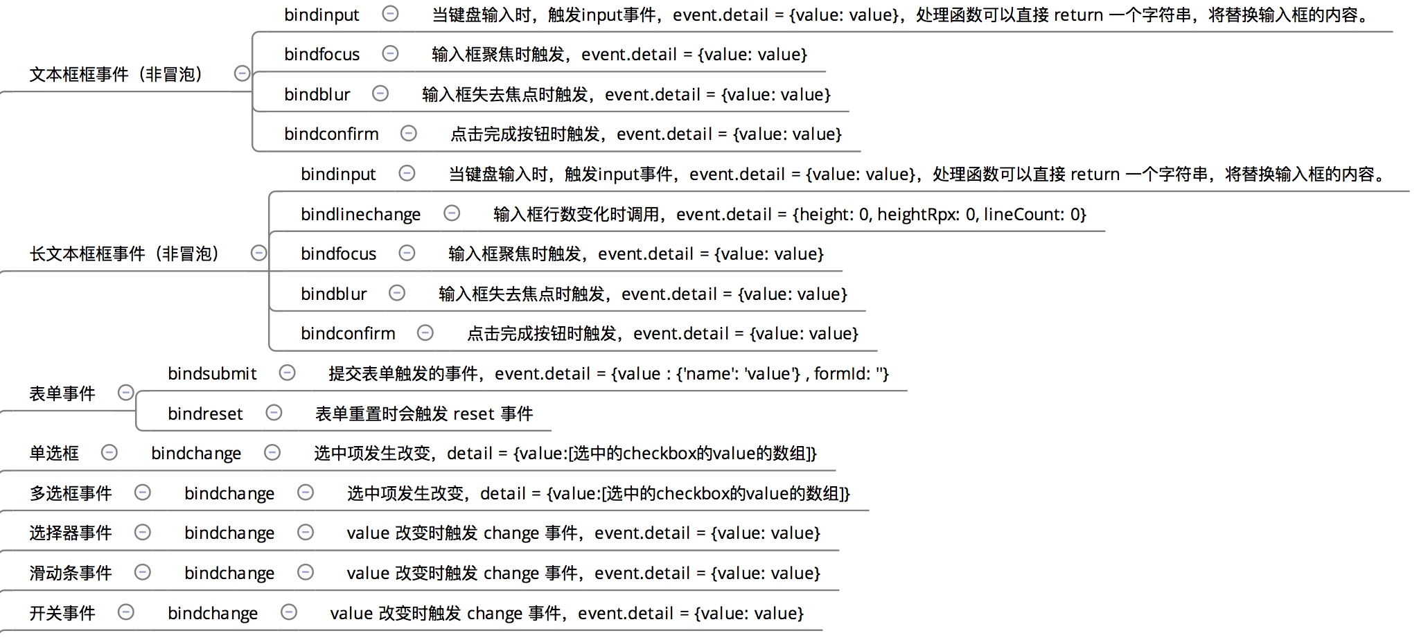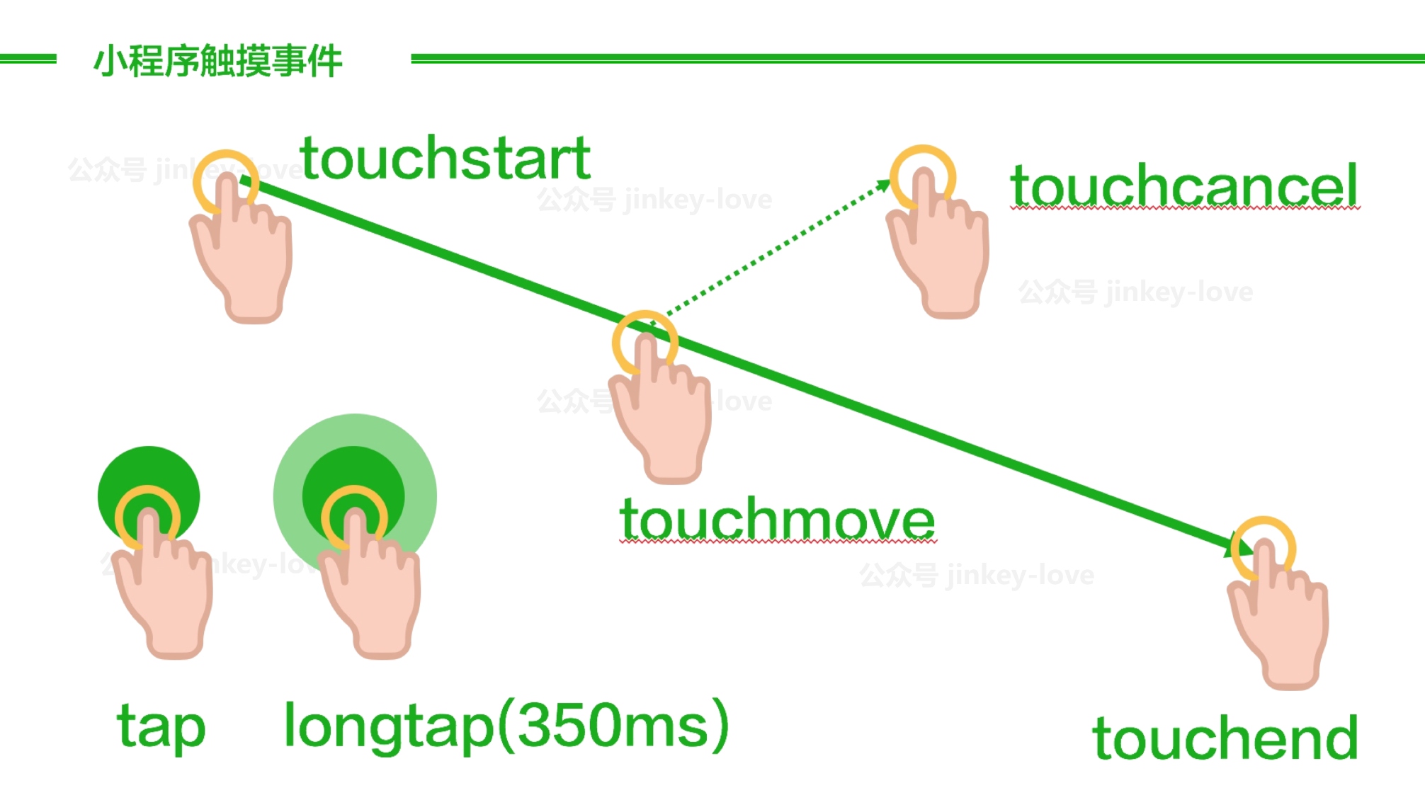 分為點擊、長按、觸摸開始、觸摸移動(比如可用于拖拽排列列表)、觸摸結束、觸摸取消(比如一個看視頻的小程序要求你兩只手都按著手機才能播放,在你看到快高潮的時候,女朋友打電話來,就會觸發 touchcancel 事件)