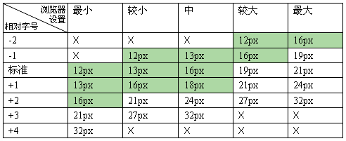 從表中可以看到,沒有一個相對字體大小可以落在12 px - 16 px區(qū)間,也就是說,如果IE“文字大小”選項(xiàng)的“最小”逐漸改為“大”,因此,不管什么相對設(shè)置字體大小,總能保持理想的顯示效果。從表中可以看出,設(shè)置為““-2、-1、標(biāo)準(zhǔn)大小、+1、+2”的文字,在調(diào)整的過程中瀏覽器的“大小”,有時候顯示的字體大小12 px - 16 px范圍內(nèi)。往往需要各種不同的頁面大小字號來區(qū)分不同的內(nèi)容,應(yīng)該選擇什么樣的相對字體大小?中國設(shè)計師的選擇并不多。