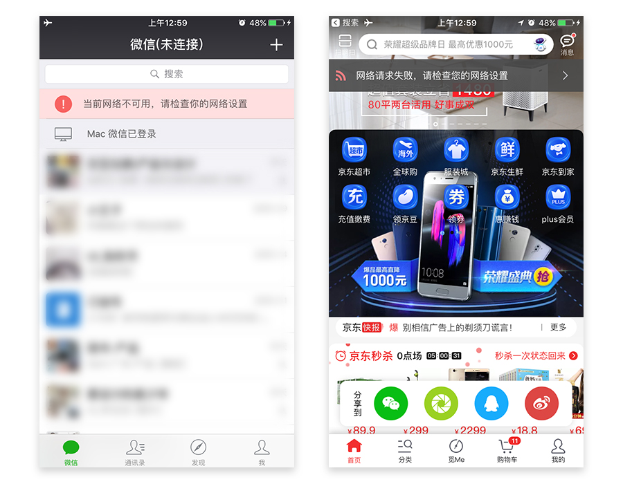上圖的閃電購和微博都采用了toast的形式提示用戶網(wǎng)絡(luò)異常。