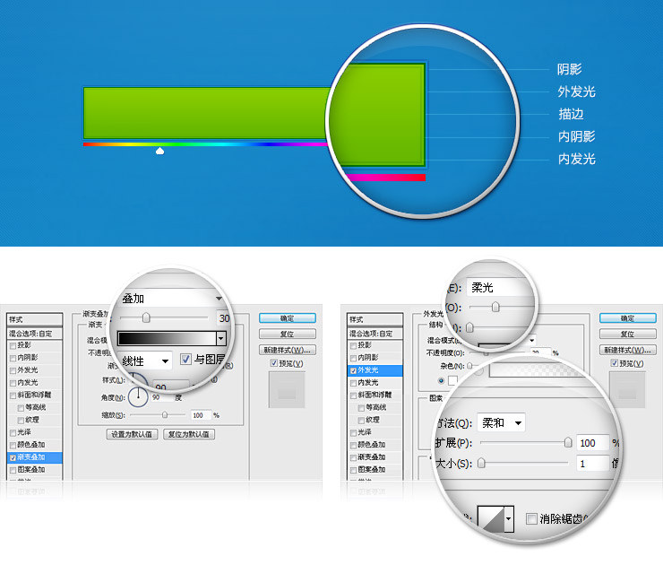 通過混合選項中的'陰影、外發光、描邊(不適用疊柔法)、內陰影、內發光'可以自由的刻畫5層像素級細節(當然,通常在實際的使用中刻畫1到3層即可)。