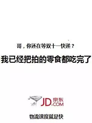 雙十一期間各大電商平臺撕逼,京東通過將你在等快遞而我已經(jīng)收到快遞并且把寶貝都吃完的情境進(jìn)行強(qiáng)烈對比,突出京東物流的快速,暗示消費(fèi)者網(wǎng)上購物使用京東比使用某寶更明智。