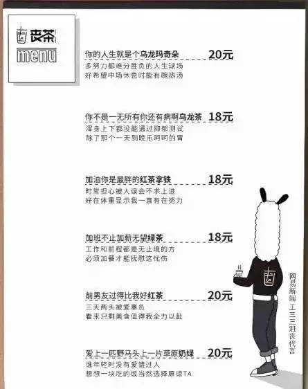 最近有一種“負能量”品牌挺火,比如,臺灣月葉奶茶推出4款“消極杯”,在奶茶杯蓋上赫然印著“體重不會因為少喝一杯飲料就變輕”、“好東西就應該跟好朋友分享,啊,我忘了我沒有朋友”等充滿負能量的話語。餓了么和網易新聞聯合出品的頗具事件營銷意味的“喪茶”,更是從奶茶命名上就充滿了負能量,比如有售價18元的“你不是一無所有你還有病啊烏龍茶”、20元的“前男友過得比我好紅茶”等。