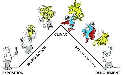 ·情節(jié)。許多設(shè)計(jì)師在進(jìn)行設(shè)計(jì)的時(shí)候,會(huì)跳過(guò)上下文環(huán)境、使用場(chǎng)景和基礎(chǔ)的設(shè)定與流程,直接進(jìn)入細(xì)節(jié)設(shè)計(jì),這樣做是很容易出現(xiàn)錯(cuò)漏的。故事應(yīng)該擁有基礎(chǔ)架構(gòu),設(shè)定和劇情的,有起因,經(jīng)過(guò),結(jié)果。所以,在故事板當(dāng)中,應(yīng)該給你所設(shè)定的角色一個(gè)目標(biāo),有東西觸發(fā)事件開(kāi)始,并且通過(guò)執(zhí)行,完成任務(wù),或者階段性結(jié)束任務(wù),為角色留下新的問(wèn)題。我們可以使用 Freytag 的金字塔來(lái)描述情節(jié):